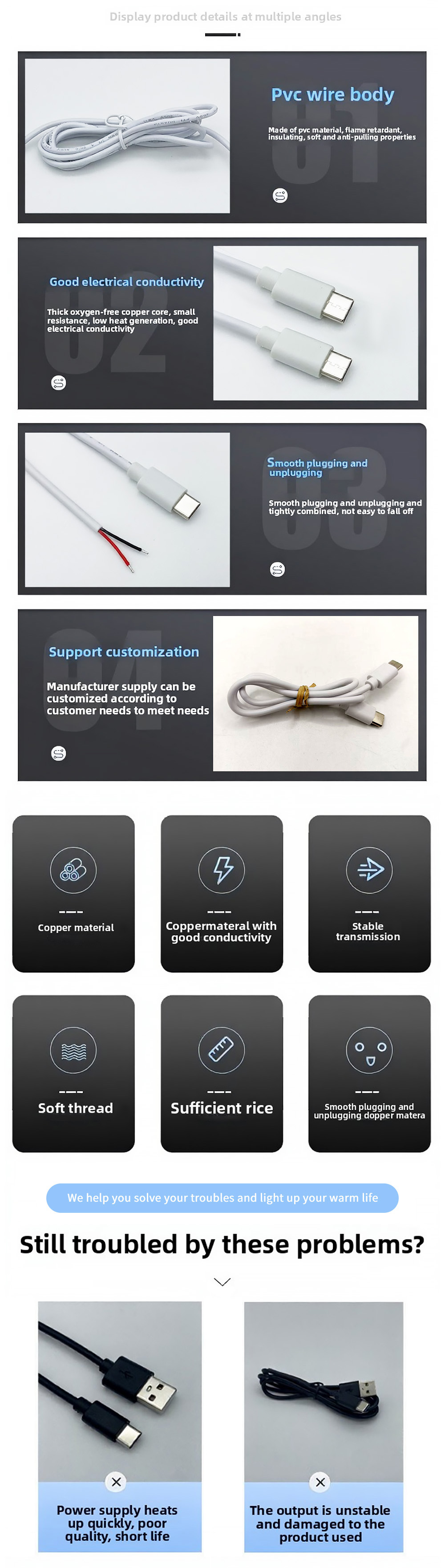 Fitur keselamatan termasuk pelindung over-voltage pencegahan sirkuit pendek dan kontrol suhu. Kabel beroperasi secara efektif dari -20 ° C hingga 70 ° C dengan standar isolasi PVC yang tahan api UL94 V-0 standar. Opsi kustomisasi termasuk panjang kabel 0,5m hingga 2m variasi warna dan logo khusus.